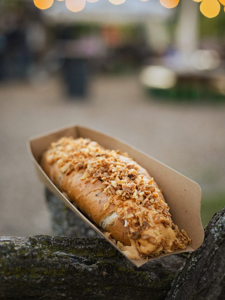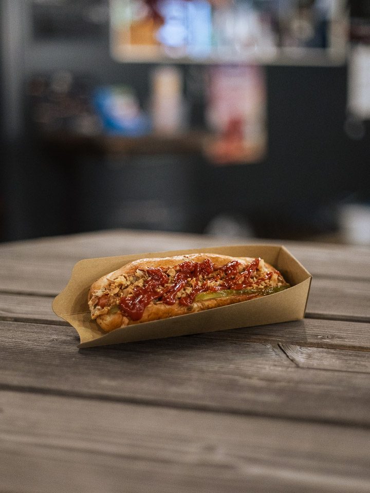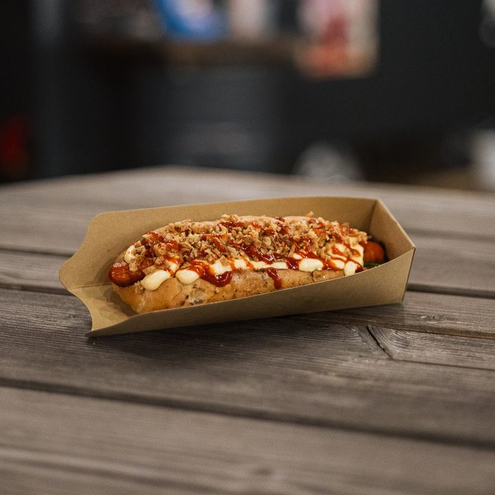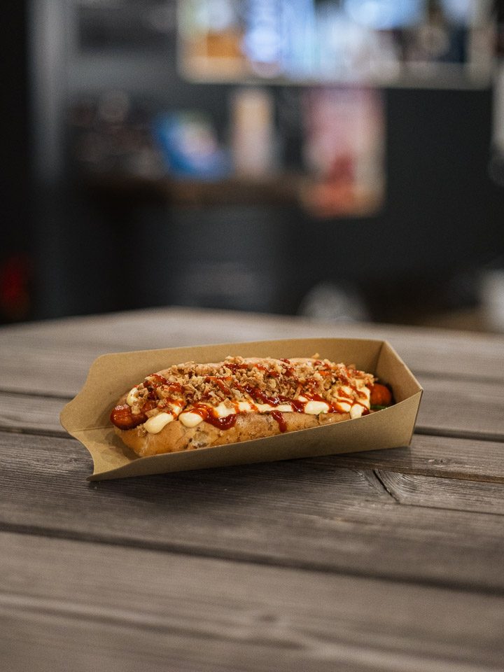 rožok, klobása, rajčinová salsa, pražená cibuľka, rímsky šalát, sriracha chilli, chilli majonéza (1,3,7,11)