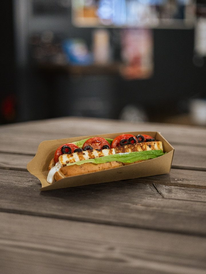 rožok, halloumi syr, plátok paradajky, čierne olivy, rímsky šalát, tzatziki, majonéza (1,3,7,10,11)